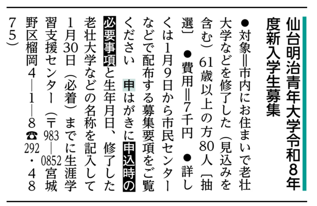 2025年12月25日 / 最終更新日時 : 2025年12月25日 52谷口 お知らせ 12/25 市政だよりに新入学生募集記事が掲載されました 市政だより令和8年1月号に仙台明治青年大学新入学生募集の記事が掲載されました。詳しくは1月9日から市民センターなどで配布する募集要項をご覧ください。(仙台市市政だよりはこちら)