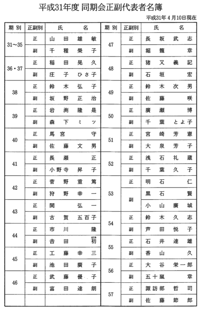 平成31年 同期会正・副代表者名簿