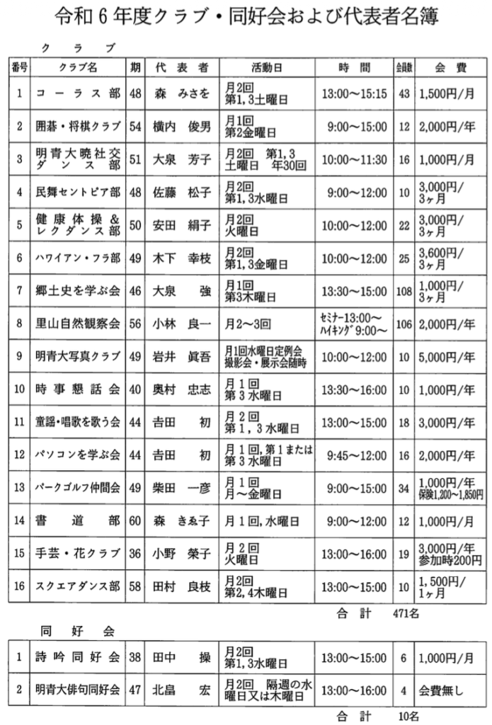 令和6年度クラブ・同好会の活動日一覧