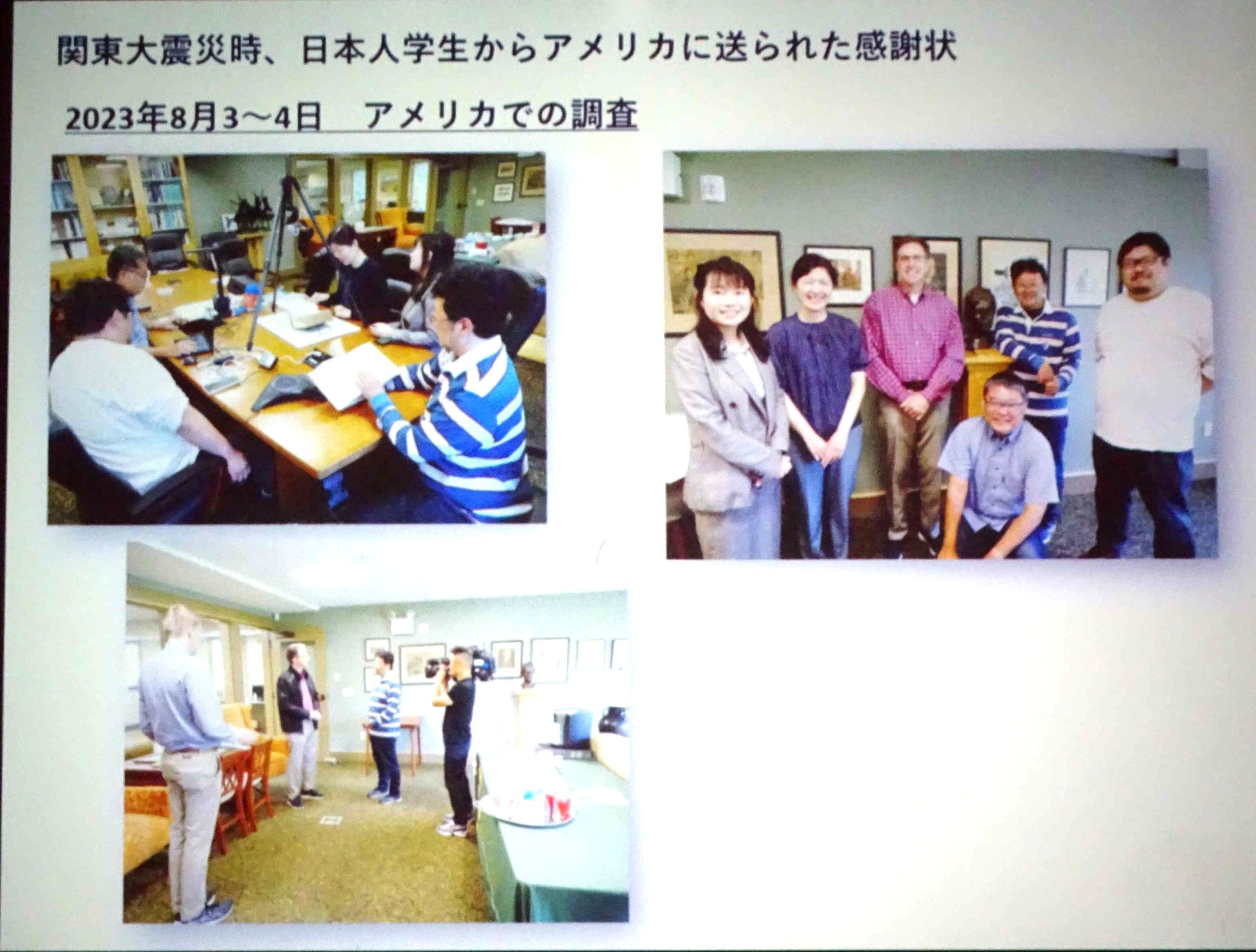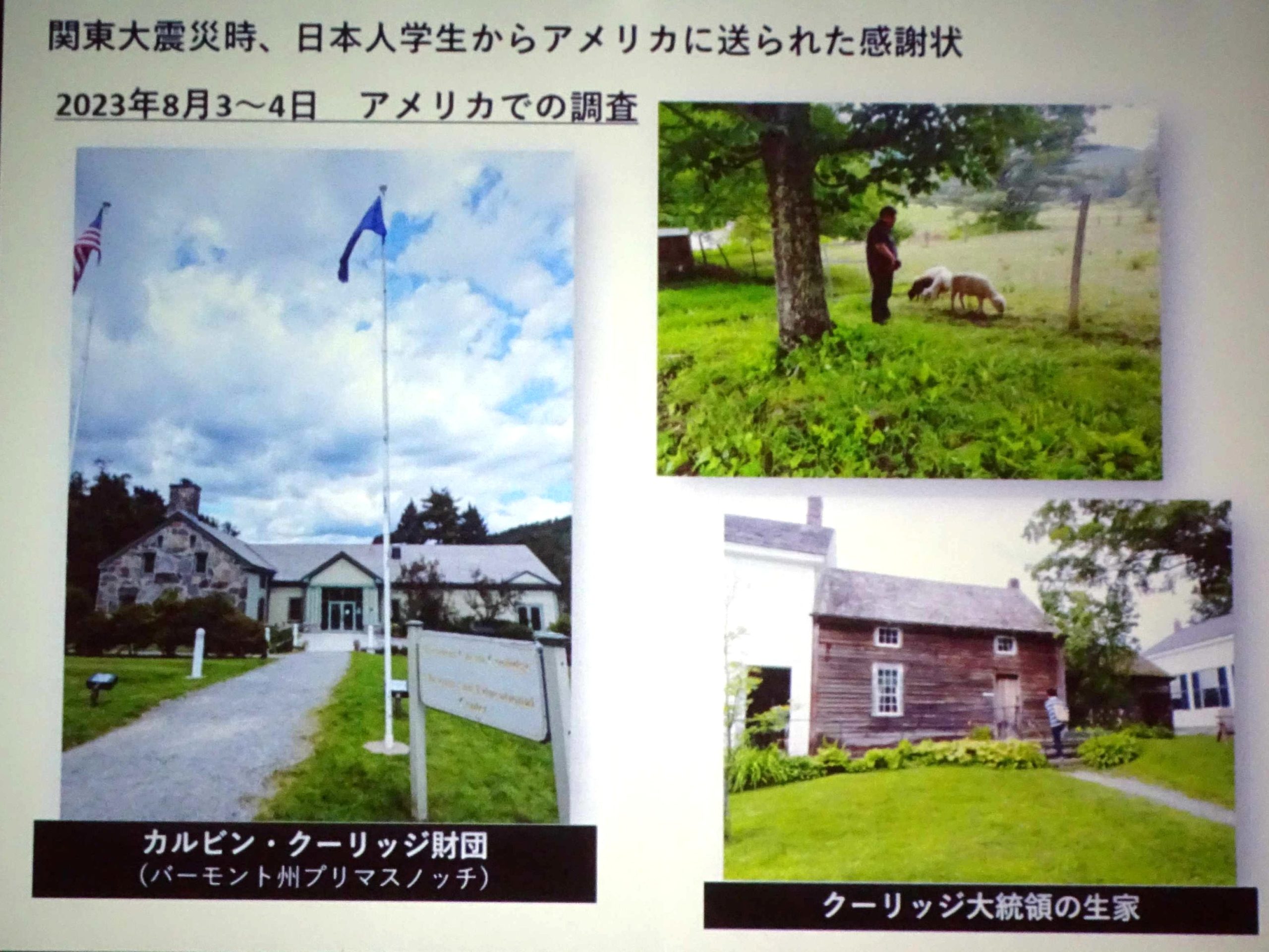 関東大震災時のアメリカの救援に対する感謝と、日米間の友情増進の願いを伝える746通の感謝状が、アメリカ第30代大統領カルビン・クーリッジ氏の生地バーモンド州に残っている。100年前の感謝状について2023年8月,アメリカで調査が行われた。