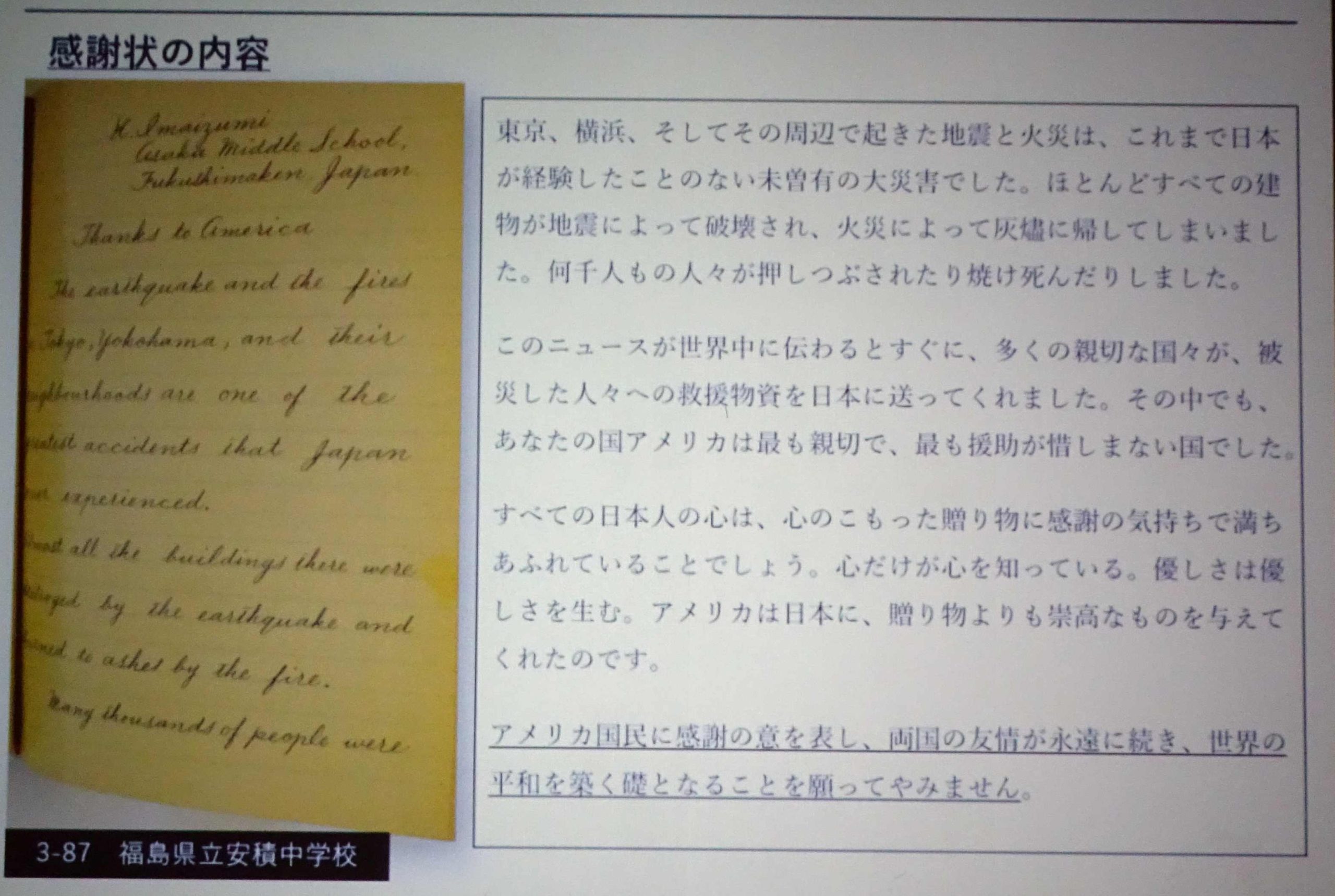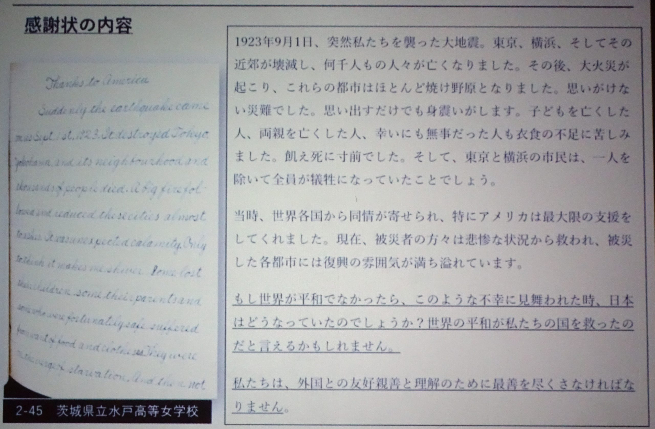 「もし世界が平和でなかったら、このような不幸に見舞われた時、日本はどうなっていたのでしょうか? 世界の平和が私たちの国を救ったのだといえるのかもしれません」 ~~~~~ 水戸高等女学校生徒の手紙